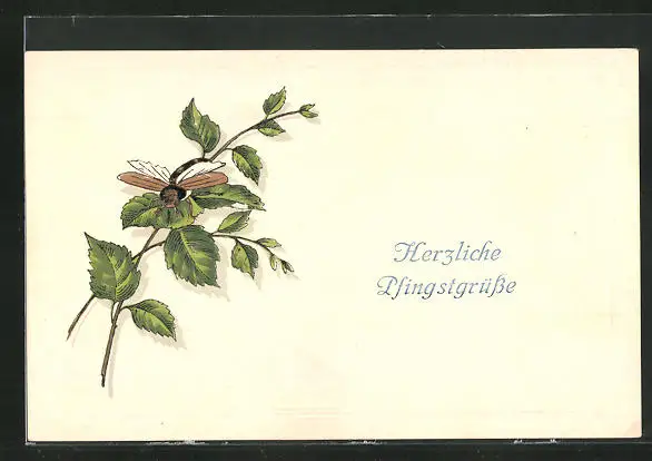 Präge-Künstler-AK Maikäfer auf einem Birkenzweig, Pfingstgruss