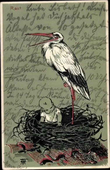 Präge Künstler Ak Baby und Storch im Vogelnest