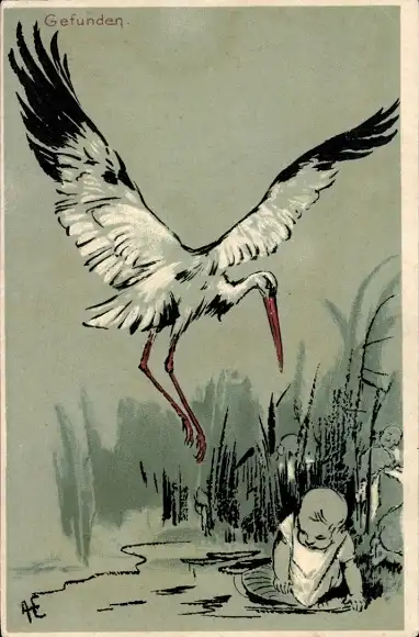 Präge Künstler Ak Gefunden, Storch, Baby, Geburt, Teich