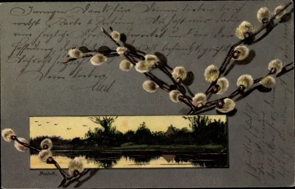 Präge Künstler Ak Mailick, Weidenkätzchen, Wasserpartie