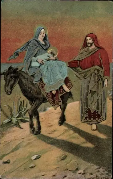 Präge Künstler Ak Nyström, J., Maria, Josef, Jesuskind, Esel