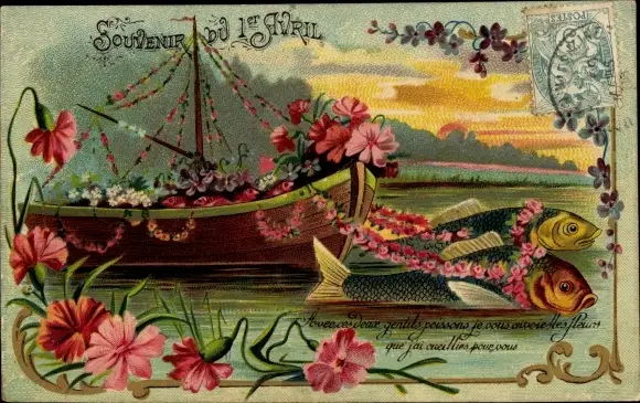 Präge Litho 1. April, Ier Avril, Fische ziehen ein Boot mit Blumen
