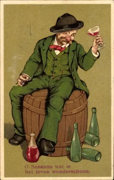 Präge Litho Betrunkener Mann mit leeren Weinflaschen auf Weinfass sitzend
