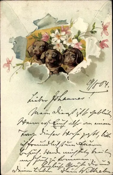 Präge Litho Drei kleine Dackel, Dackelwelpen, Kitsch