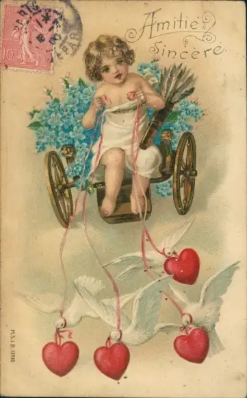 Präge Litho Engel, Vergissmeinnicht, Tauben, Herzen, Amor
