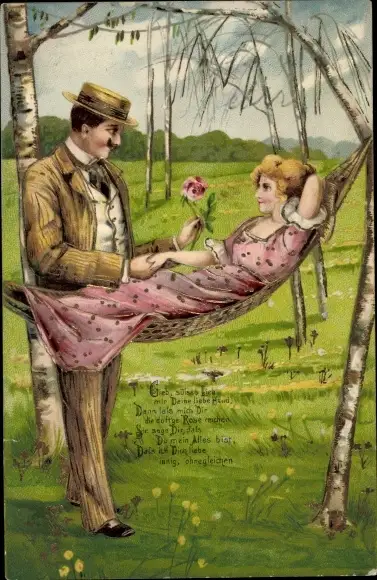 Präge Litho Frau auf einer Hängematte, Mann mit Rose, Liebespaar