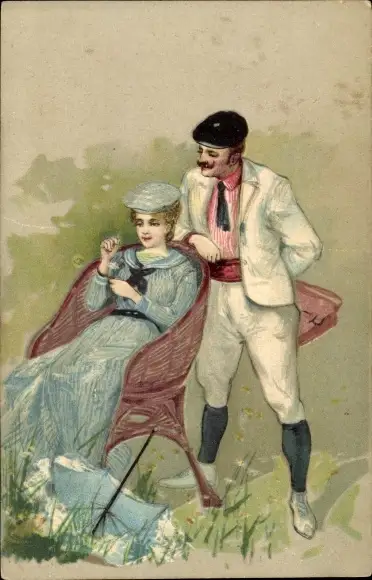 Präge Litho Frau sitzt in einem Korbstuhl, Mann, Liebespaar