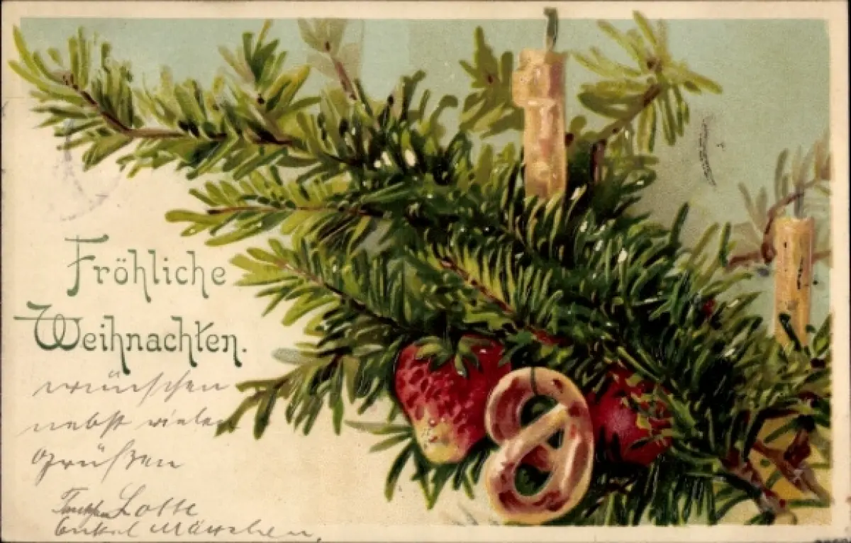 Präge Litho Frohe Weihnachten, Tannenzweig, Kerzen, Brezel