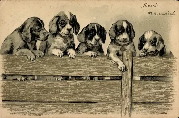 Präge Litho Fünf Hundewelpen an einem Holzzaun