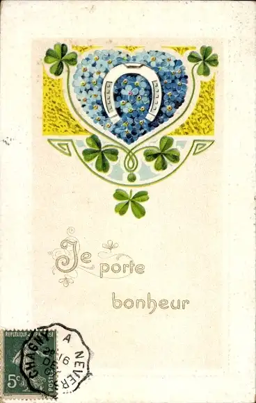Präge Litho Glücksbringer, Hufeisen, Vergissmeinnicht, Klee