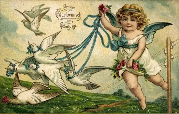 Präge Litho Glückwunsch Geburtstag, Engel, Tauben