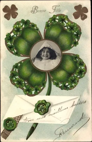 Präge Litho Glückwunsch, Kind-Portrait, Glücksklee, Brief