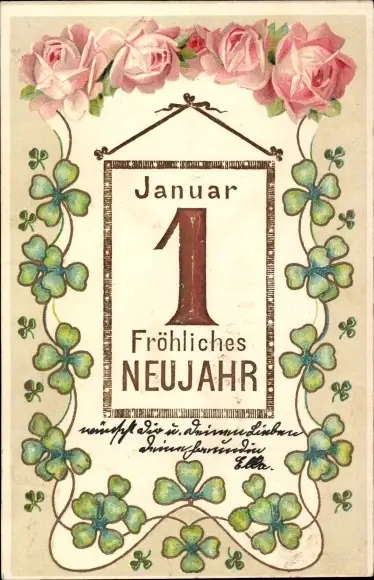 Präge Litho Glückwunsch Neujahr, 1 Januar, Kalender, Kleeblätter, Rosenblüten
