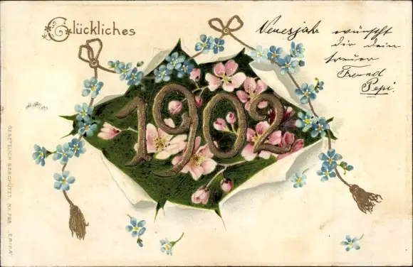 Präge Litho Glückwunsch Neujahr 1902, Blumen, Vergissmeinnicht