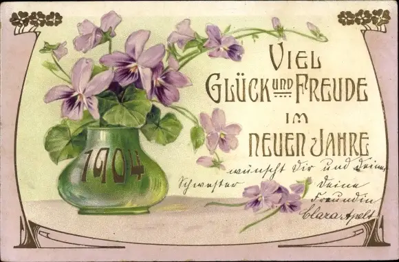 Präge Litho Glückwunsch Neujahr 1904, Veilchen, Blumenvase