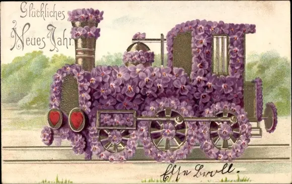 Präge Litho Glückwunsch Neujahr, Dampflok, Veilchen