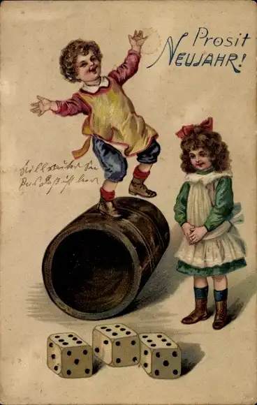 Präge Litho Glückwunsch Neujahr, Junge balanciert auf einem Würfelbecher
