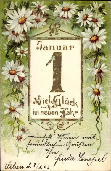 Präge Litho Glückwunsch Neujahr, Kalender, Margeriten