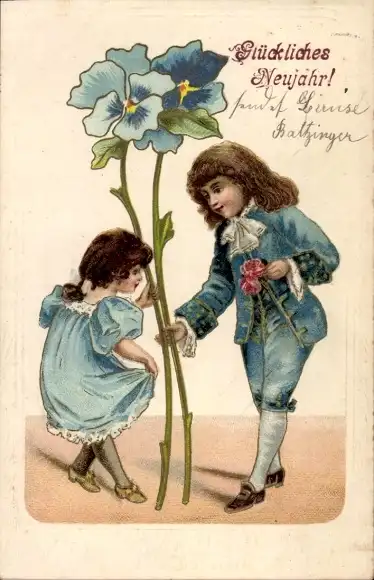 Präge Litho Glückwunsch Neujahr, Kinder in blauer Kleidung, Stiefmütterchen