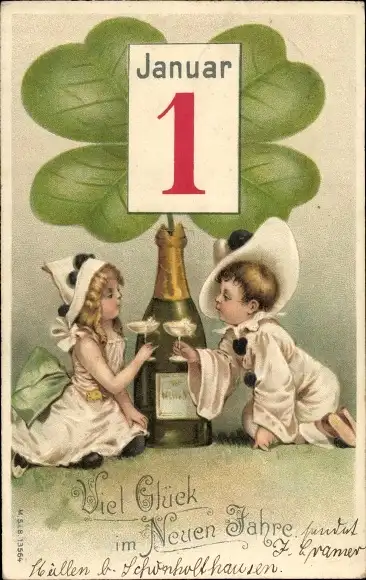 Präge Litho Glückwunsch Neujahr, Pierrot, Pierrette, Sektflasche, Kleeblatt, Kalenderblatt