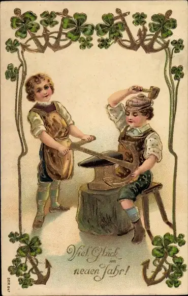 Präge Litho Glückwunsch Neujahr, Schmiede, Anker, Kleeblätter