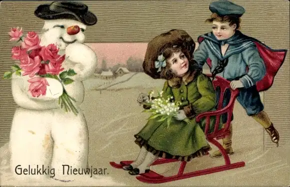 Präge Litho Glückwunsch Neujahr, Schneemann, Junge auf Schlittschuhen, Schlitten