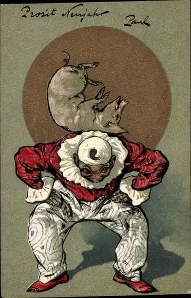 Präge Litho Glückwunsch Neujahr, Schwein auf Harlekins Rücken