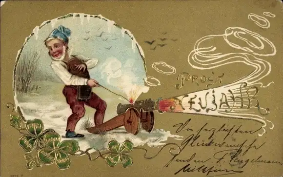Präge Litho Glückwunsch Neujahr, Zwerg, Kanone, Glücksklee