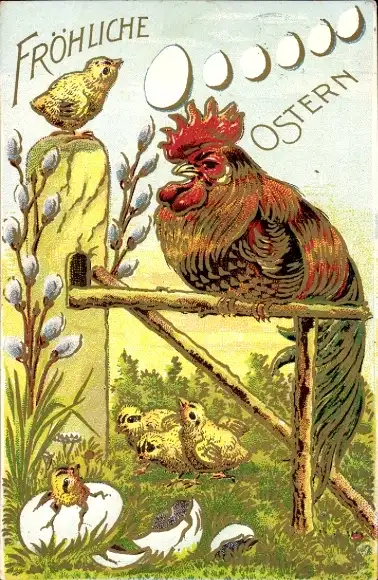 Präge Litho Glückwunsch Ostern, Hahn, Küken, Weidenkätzchen