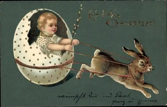 Präge Litho Glückwunsch Ostern, Osterhase, Kind im Ei, Weidenkätzchen
