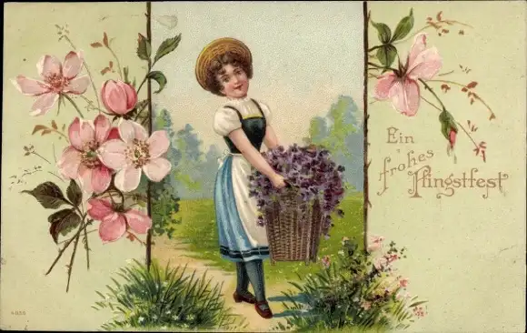 Präge Litho Glückwunsch Pfingsten, Mädchen mit Blumenkorb