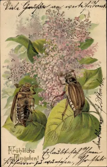 Präge Litho Glückwunsch Pfingsten, Maikäfer auf Fliederblättern