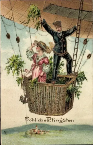 Präge Litho Glückwunsch Pfingsten, Paar in einem Ballon