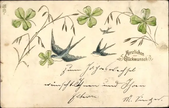 Präge Litho Glückwunsch, Schwalben, Glücksklee