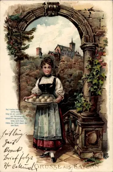Präge Litho Grüße aus Bayern, Frau in Tracht, Klöße