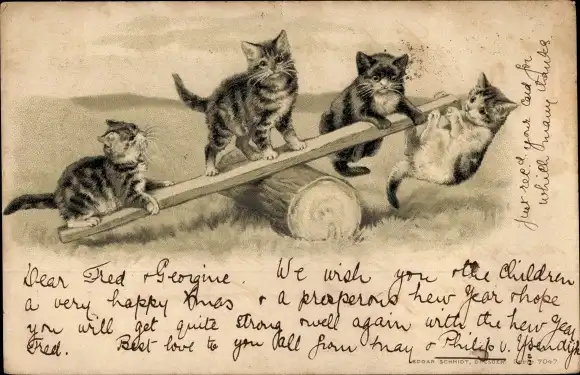Präge Litho Hauskatzen, Katzen vermenschlicht, Wippe