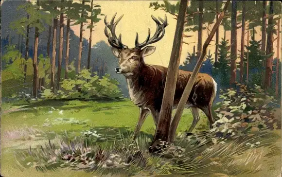 Präge Litho Hirsch im Wald, Wiese, Geweih