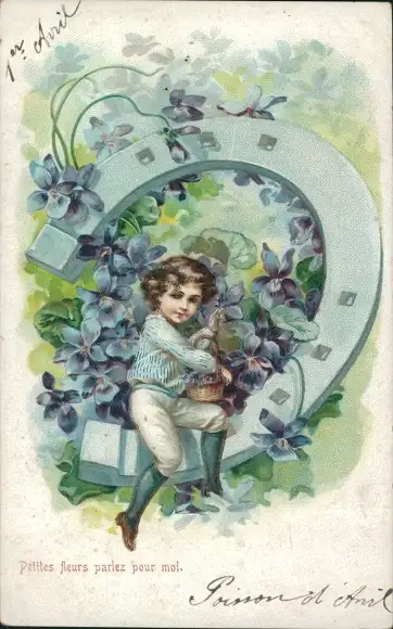 Präge Litho Junge, Hufeisen, Veilchen, Kitsch