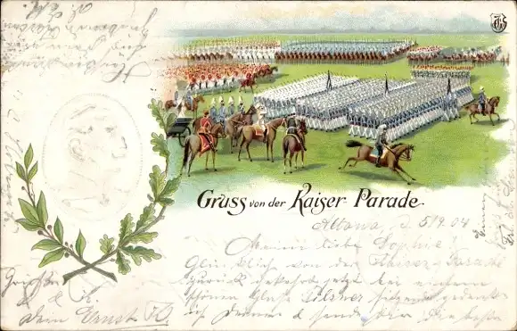 Präge Litho Kaiser Wilhelm II., Portrait, Manöverplatz, Truppenparade