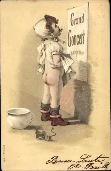 Präge Litho Kind mit Schnuller und Holzspielzeug, Nachttopf, Grand Concert, Humor