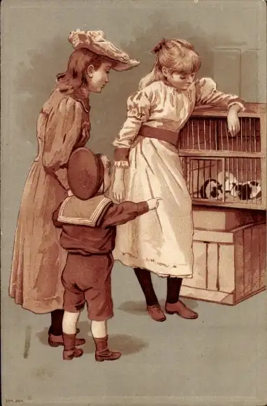 Präge Litho Kinder beobachten Meerschweinchen in einem Käfig