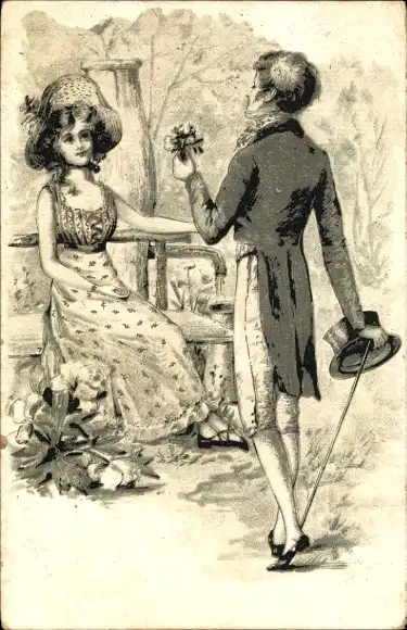 Präge Litho Liebespaar, Frau auf einer Bank, Mann, Zylinder
