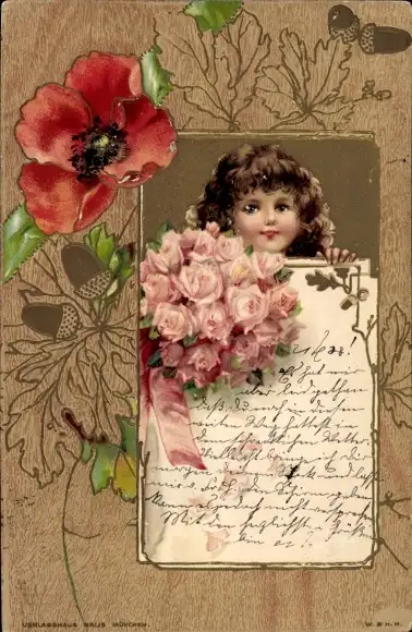Präge Litho Mädchen mit Blumenstrauß, Rosen, Mohn