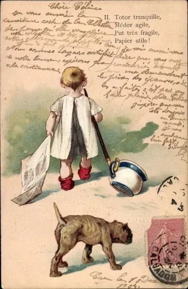Präge Litho Totor tranquille, Medor agile, Kind mit Nachttopf, Hund