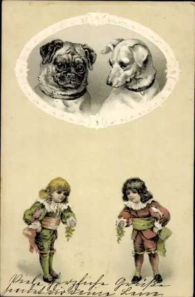 Präge Litho Zwei Jungen und Portrait zweier Hunde