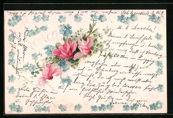 Präge-Lithographie Alpenveilchen und Vergissmeinnicht