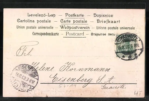Personenbezogene Daten auf der Rückseite der Karte wurden durch blauen Textmarker unkenntlich gemacht. Die blauen Stellen sind auf die Vorderseite durchgeweicht und wirken sich negativ auf das Postkartenfoto aus