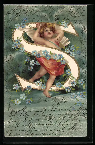 Präge-Lithographie Amor mit Buchstabe S und Vergissmeinnicht