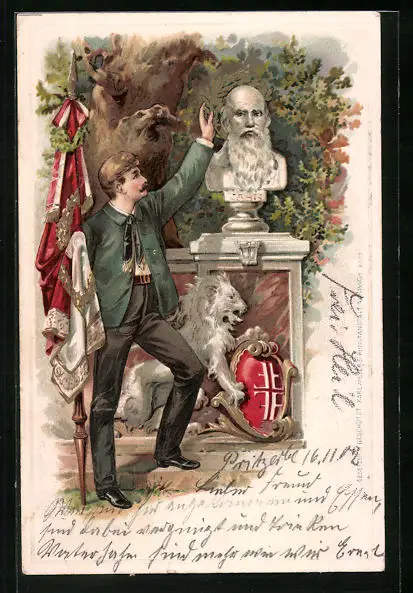 Präge-Lithographie Büste vom Turnvater Jahn mit Lorbeerkranz, Wappen mit Löwen