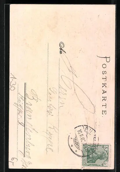Personenbezogene Daten auf der Rückseite der Karte wurden durch blauen Textmarker unkenntlich gemacht. Die blauen Stellen sind auf die Vorderseite durchgeweicht und wirken sich negativ auf das Postkartenfoto aus